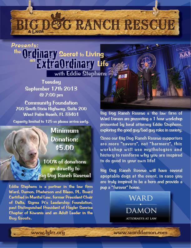 Big Dog Ranch Rescue and the law firm of Ward Damon are presenting a 1 hour workshop presented by local attorney Eddie Stephens, and will explore the good guy/bad guy roles in society and is based on the teachings of Joseph Campbell.