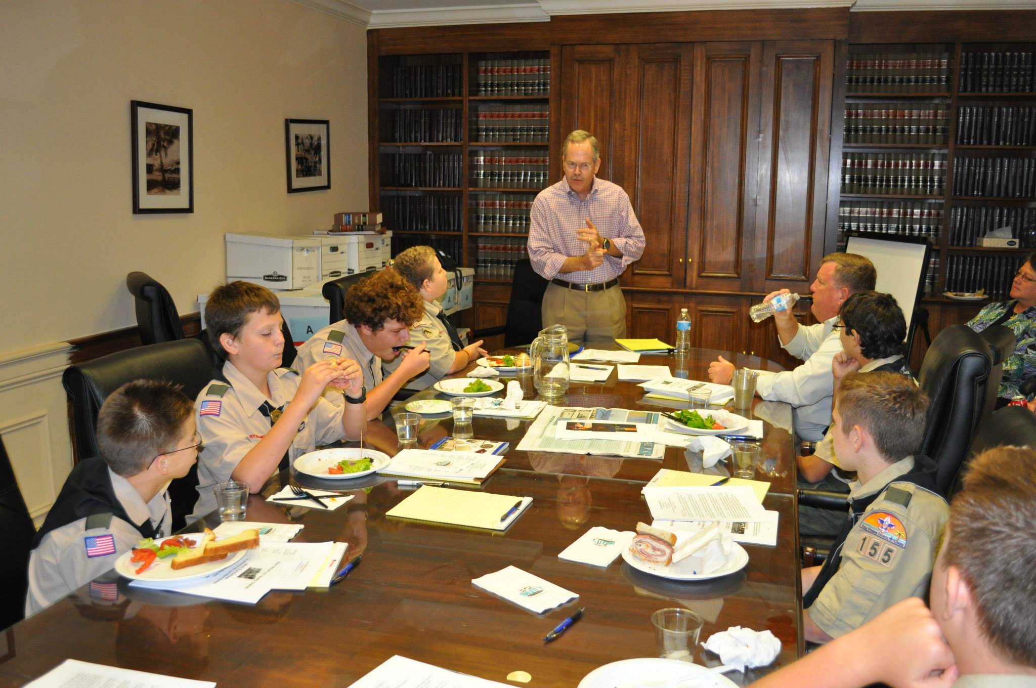 Attorneys Denise Bleau and Eddie Stephens along with Judge Gillen and Judge Phillips conducted a mock trial clinic where the Scouts learned the different parts of a trial, how to conduct a direct examination, cross examination, evidentiary objections and all of the elements of a successful opening statement.