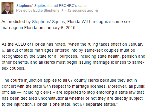 As predicted by this site, Florida WILL recognize same sex marriage as of January 6, 2015 per the Palm Beach Post and ACLU Florida the State of Florida has abandoned the ill fated fight to prohibit equality, Effective January 6, 2015 all 67 counties in Florida will issue marriage licenses to same sax applicants. Further, when the ruling takes effect on January 6, all out of state marriages entered into by same-sex couples must be recognized by the State for all purposes, including state health, pension and other benefits, and all clerks must begin issuing marriage licenses to same-sex couples.