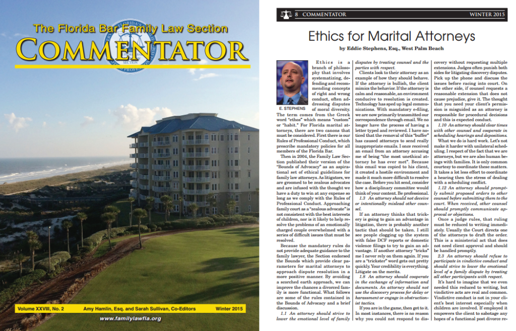 For Florida marital attorneys, there are two canons that must be considered. First there is our Rules of Professional Conduct, which prescribe mandatory policies for all members of the Florida Bar.