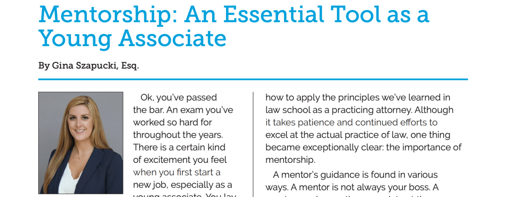 I quickly realized law school did not prepare us for the “real world” and daily tasks that are required by attorneys, nor did it teach us how to apply the principles we’ve learned in law school as a practicing attorney. Although it takes patience and continued efforts to excel at the actual practice of law, one thing became exceptionally clear: the importance of mentorship. A mentor’s guidance is found in various ways.