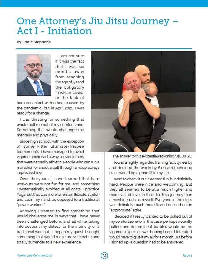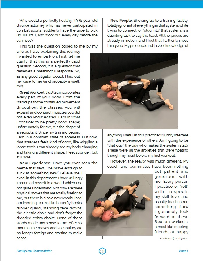Stress: Practicing family law is stressful. Stress can cause many physical and mental health issues. Training in Jiu Jitsu causes many chemical reactions in the body that help me relieve stress and feel more satisfied and positive about my work and life.