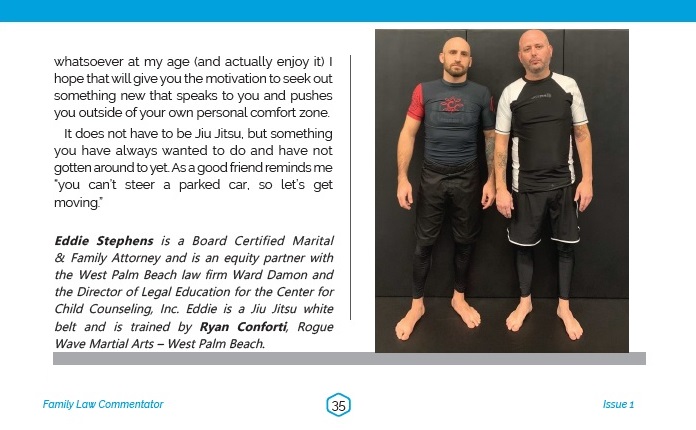 Eddie Stephens is a Board Certified Marital & Family Attorney and is an equity partner with the West Palm Beach law firm Ward Damon and the Director of Legal Education for the Center for Child Counseling, Inc. Eddie is a Jiu Jitsu white belt and is trained by Ryan Conforti, Rogue Wave Martial Arts – West Palm Beach.