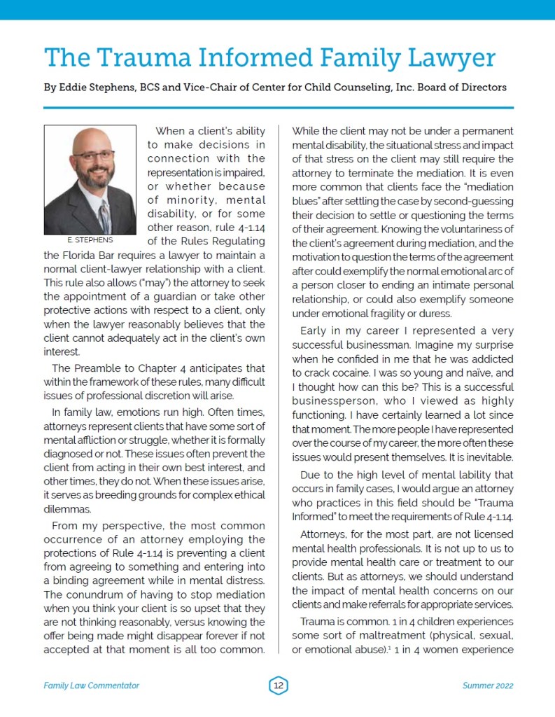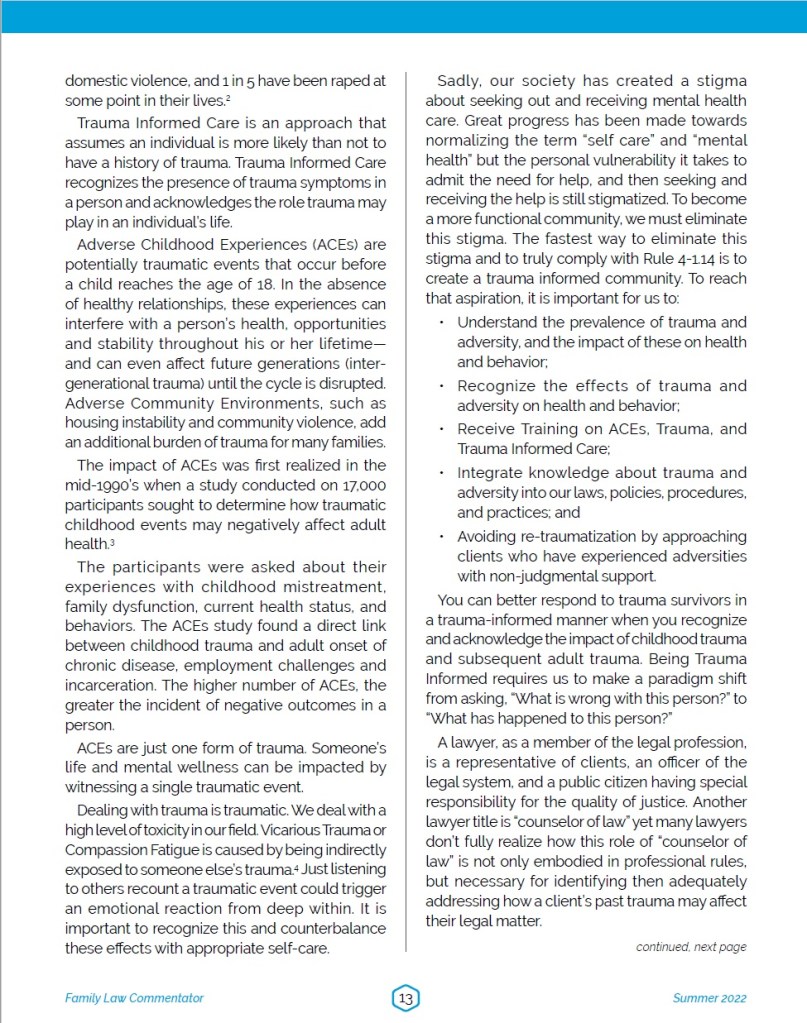 Due to the high level of mental lability that occurs in family cases, I would argue an attorney who practices in this field should be “Trauma Informed” to meet the requirements of Rule 4-1.14.