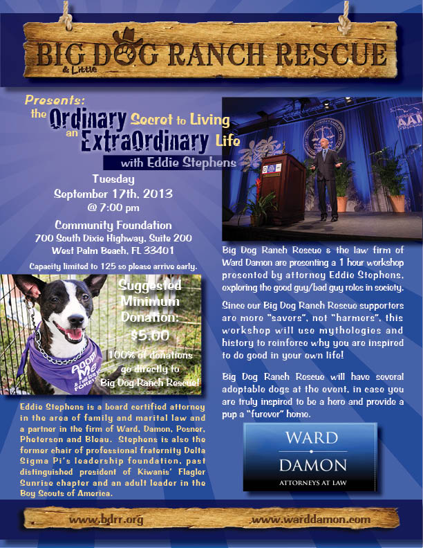 He’s also a popular law lecturer and a motivational speaker. He’ll give a free lecture, “The Ordinary Secret for Living an Extraordinary Life, on Sept. 17 to raise awareness for the Big Dog Ranch Rescue.