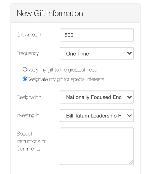 Be sure to properly designate your gift by choosing “National Focused Endowments” for Designation and “Bill Tatum Leadership Fund” for Investing in. See below!